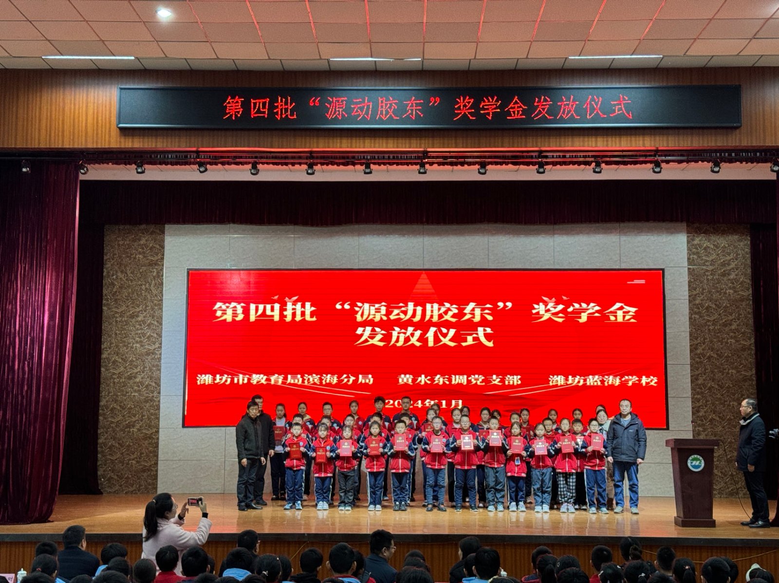 1月17日下午,黃水東調(diào)黨支部聯(lián)合濰坊藍(lán)海學(xué)校在藍(lán)海學(xué)校行政樓報(bào)告廳舉行了第四批“源動(dòng)膠東”獎(jiǎng)學(xué)金頒發(fā)儀式,對(duì)藍(lán)海學(xué)校2023學(xué)年榮獲獎(jiǎng)學(xué)金的42名優(yōu)秀學(xué)生進(jìn)行表彰。濱海區(qū)教育分局黨組成員、副局長袁玉松,山東水發(fā)黃水東調(diào)工程有限公司黨支部書記、董事長申勇,總經(jīng)理宋致軍,濰坊藍(lán)海學(xué)校黨支部書記、校長楊偉平等出席,共計(jì)300余名師生參加此次活動(dòng)。